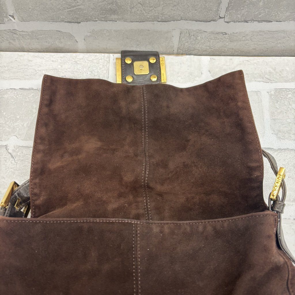 FF マンマバケットは1990年代に初めて登場し、瞬く間に人気を博しました。このバッグのデザインは、女性のシルエットに美しく寄り添うように設計されています。マンマバケットという名前は、その丸みを帯びた形状が母親(Mamma)を連想させることから名付けられました。このバッグは、シンプルでありながら魅力的なデザインで、日常使いにも、フォーマルな場にも対応できる万能アイテムです。特にスエード素材はタッチが優しく、時代を超えて愛され続ける魅力を持っています。